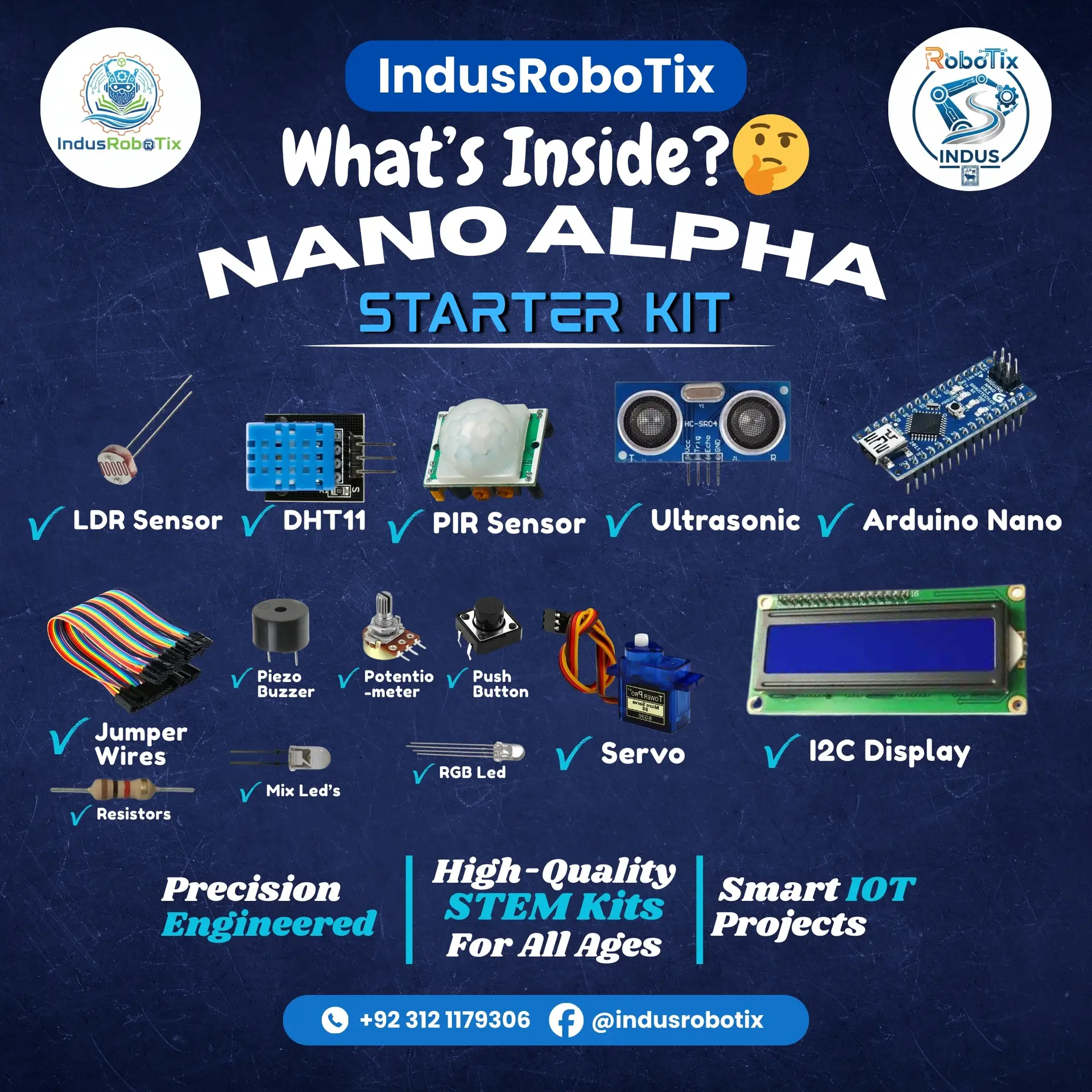 The Nano Alpha Starter Kit by IndusRoboTix is designed to be the ultimate launchpad for aspiring engineers and hobbyists. Built around the versatile Arduino Nano microcontroller, this kit focuses on “Learn By Building,” allowing users to transition from basic electronics to advanced Smart IoT projects.